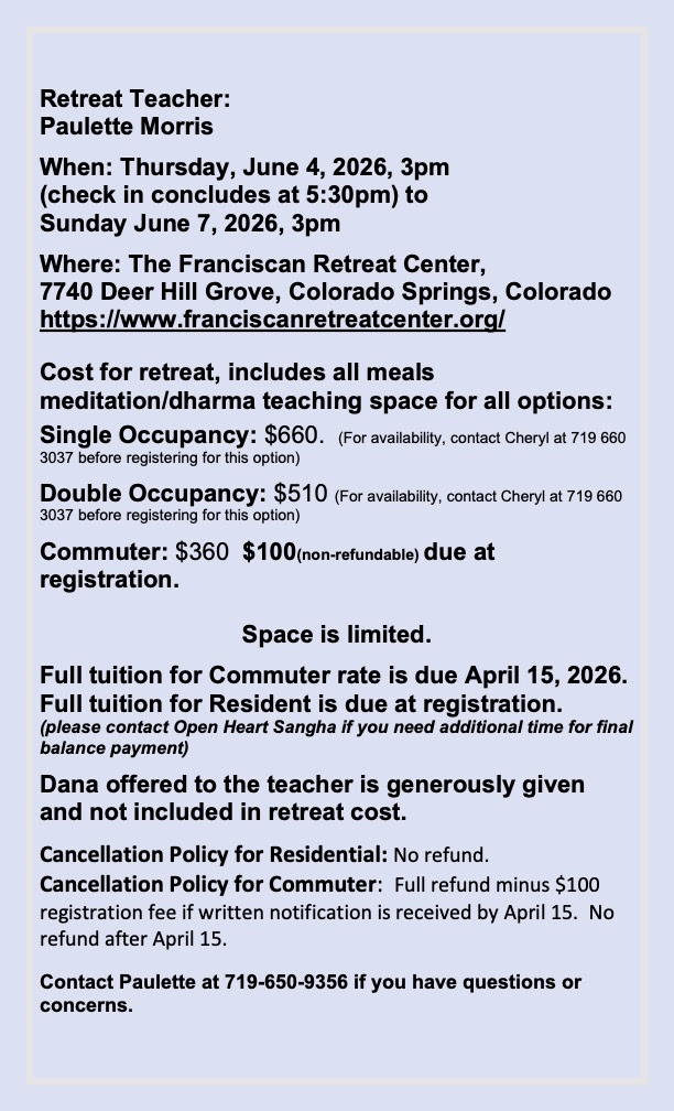 For more information contact Paulette Morris at openheartsangha@gmail.com or 719-650-9356 if you have questions or concerns.